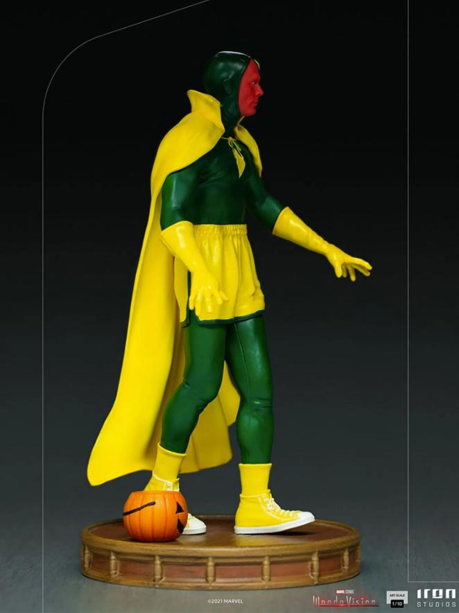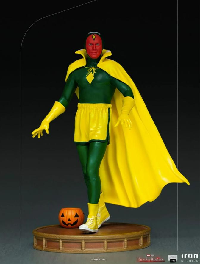 Iron Studios Vision (Halloween Costume) 1/10 Scale BRAND NEW During Halloween in the small town of Westview, New Jersey, the syntozoid Vision, formerly an ally of the Avengers, says goodbye to his wife Wanda Maximoff, with whom he shares an idyllic suburban life, along with their children Billy and Tommy, and his brother-in-law, Pietro. Vision is a volunteer on the community surveillance patrol and leaves for duty properly dressed, as the date requires. He is wearing a costume similar to the original version of the character in the comics, but with the characteristics of cosplay, in a more laid-back way, with sports shorts, sneakers, and yellow socks.