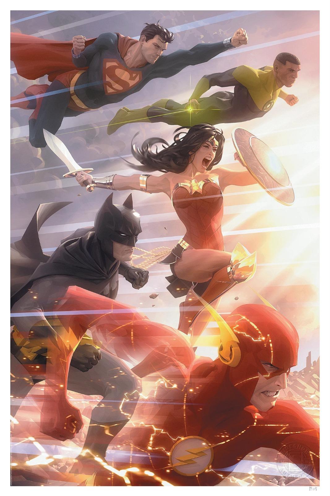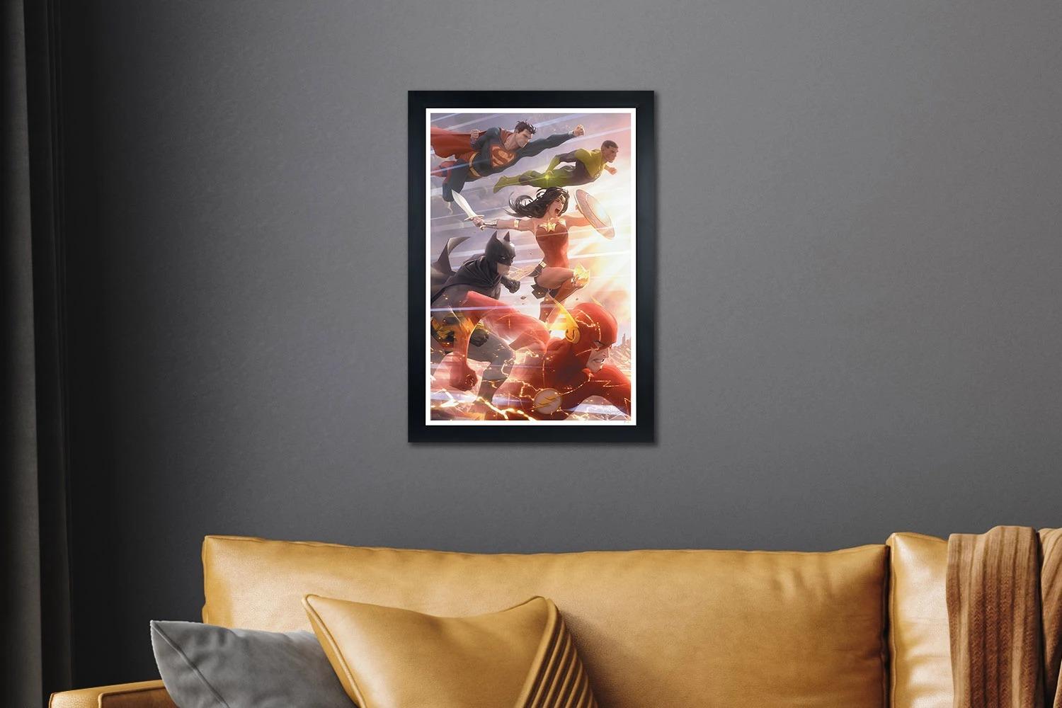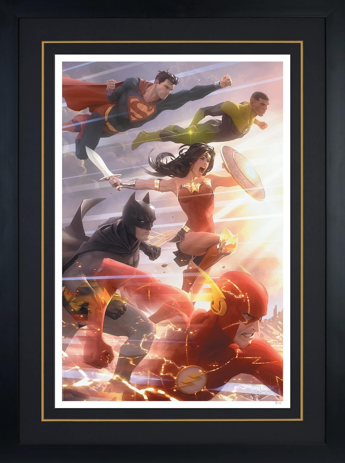Sideshow Art Print Justice League #49 by Alex Garner With Frame Sideshow Art Prints presents the Justice League #49 Fine Art Print, a dynamic DC Comics art print by celebrated illustrator Alex Garner . United in their fight for justice, DC’s bravest and boldest heroes band together to stop evil in its tracks! Justice League members Superman , Batman , The Flash, Wonder Woman , and Green Lantern > fearlessly face the dawn of a new day, working to create a better and brighter future. From the Scarlet Speedster’s visual blur to the verdant spark of John Stewart’s ring, this colorful composition is packed with heroic detail celebrating each character’s iconic design. Print details: * Officially licensed by DC Comics * Limited edition of 250 * 16 x 24” fine art giclée print, image dimensions 15 x 23” * 100% cotton rag, acid free, certified archival matte Epson Cold Press Natural, 305GSM * Epson archival inks * Embossed seal of authenticity * Including Frame: 65×79 cm *